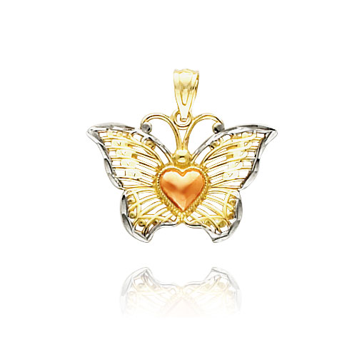 14K Yellow Gold is used to craft this elegant butterfly pendant that features rhodium trim. A Rose Gold heart is featured at the center of the butterfly, which adds a colorful, elegant touch. Diamond-cut details add style and shine and the pendant hangs from a smooth gold bail.