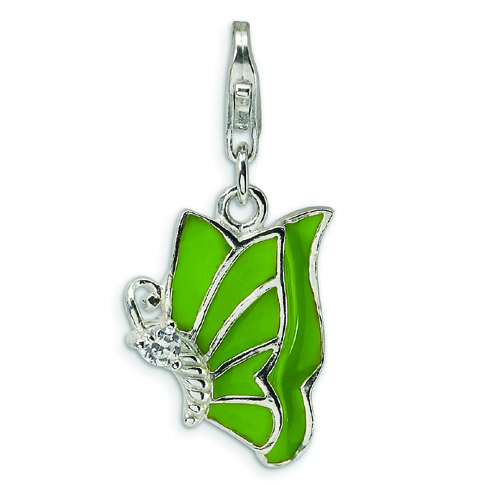 Sterling Silver Green Enameled & CZ Butterfly With Lobster Clasp Charm