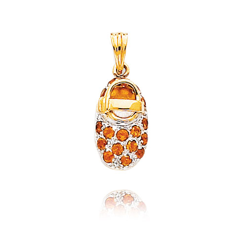 Give this keepsake as a gift to a new mother, or keep it for yourself. Rhodium covers the front of the shoe where colorful Citrine stones are prong set to represent a child born in November. 14K Yellow Gold is used to craft this beautiful baby shoe. Pendant hangs from a polished gold bail.