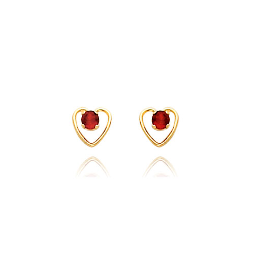 Such youthful charm! Gold has polished finish, as genuine Garnet birthstone lies in center. 14K Yellow Gold forms simple pair of cute, open hearts. Other stones available.