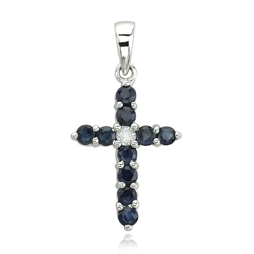 Picture of 14K White Gold Round Blue Sapphire & Diamond Cross Pendant