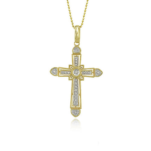 Add shine with this classic cross pendant necklace. A 16" Yellow Gold chain holds a beautiful, fancy cross adorned with shiny, round Diamonds. Also available in White Gold.
