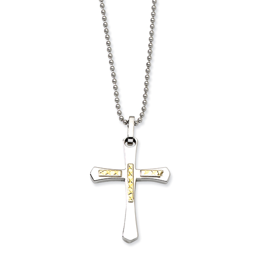 Stainless Steel 14k Gold Diamond Cut Cross Pendant 22in Necklace chain