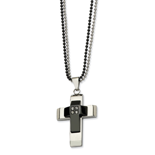 Stainless Steel Polished & Black-plated Cross w/ CZs 22in Necklace chain