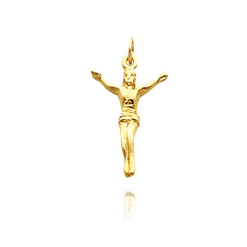 14K Yellow Gold is used to craft this corpus pendant. The pendant hangs from a thin, gold bail.