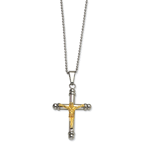 Stainless Steel Gold IPG Crucifix Pendant 22in Necklace chain