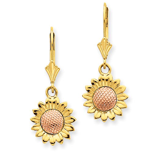 14k Two-tone Polished Sunflower Dangle Leverback Earrings