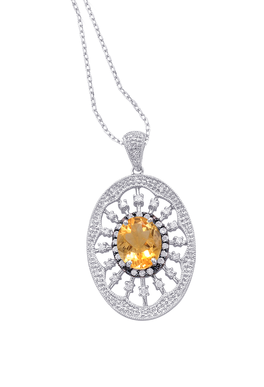 Sterling Silver Oval Pendant Necklace with Diamonds and Large Citrine
