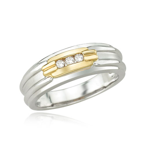 Modern and magnificent. Three round, shiny Diamonds are channel set in the yellow metal to create a lustrous look. A polished White Gold band features ribbed designs and an oval, Yellow Gold section at the top of this ring. Also available in ladies'.