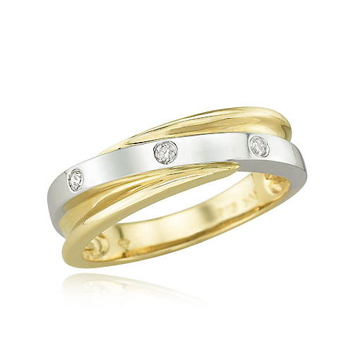 Celebrate forever with modern style. Shiny, round Diamonds are set in the White Gold for added elegance. A polished Yellow Gold band features a thin, diagonal White Gold design that adorns the front of this ring. Also available in ladies'.