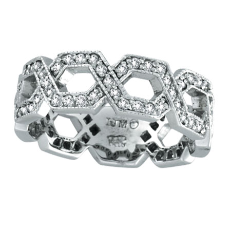 Contemporary Couture. This open hexagon-design eternity ring is beautiful and unique. Diamonds are set in White Gold across this intricate band.