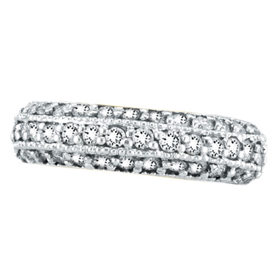 Diamond Fashion Ring in 14K white gold. 3 rows of diamonds run across the front of this ring. 40 diamonds in total, which are set in a sparkling prong setting.