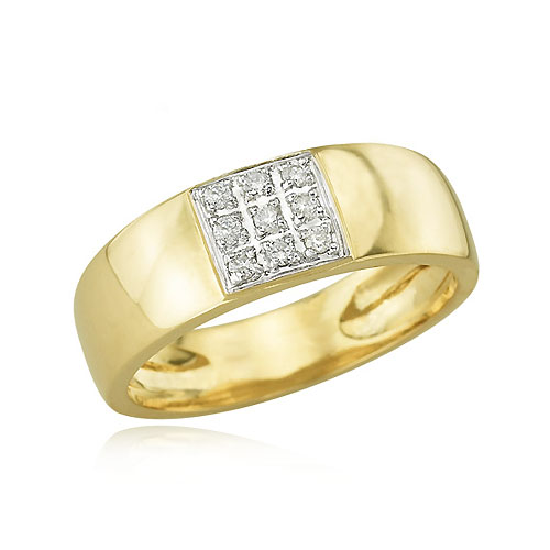 Represent your love with modern elegance. A polished Yellow Gold band features a square pattern at the front of the ring where shiny, round Diamonds are set. Also available in men's.