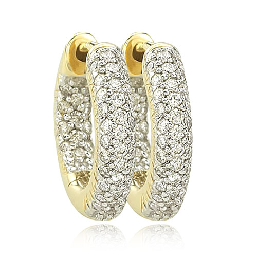 Add sparkle to any ensemble with these diamond hoop earrings. Yellow Gold polished hoops feature shiny, round Diamonds set at the front and inside of this beautiful pair for extreme shine. Also available in White Gold.