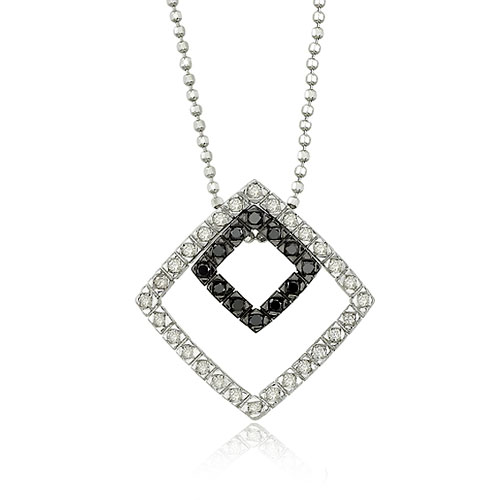 Add some edge to your style with this Diamond shapes necklace. The pendant hangs from a 16" White Gold chain. Black and White Diamonds are set in large, open diamond shapes to create this edgy look. Add Black & White Diamond Earrings to this piece for a complete look.