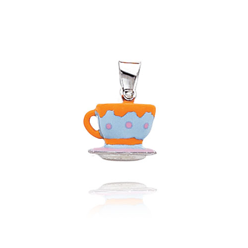 14K White Gold Blue & Orange Enameled Cup & Saucer Pendant