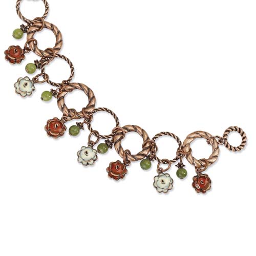 Copper-tone Orange & Ivory Enamel, Green Beads 7" Bracelet