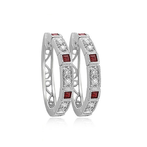 Add some beautiful color to your jewelry collection with these gemstone and diamond earrings. Stones are set in detailed patterns of White Gold for added beauty. White Gold hoops feature an alternating pattern of square Rubies and round Diamonds for a lustrous and elegant look. Add the matching ring to complete this look.
