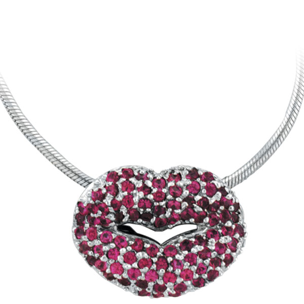 The Kiss T worn by Paula Abdul. 85 pink sapphires on this lip jewelry. Pink Sapphire Lips Pendant Necklace in 18K white gold. Comes with a 16 inch snake chain. As seen on American Idol. The designer is Morris & David.
