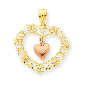 14K Two-Tone Gold Rose Filigree Heart Pendant