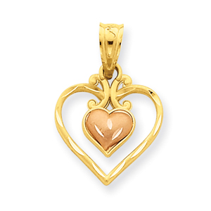 14K Two-Tone Gold Satin Diamond-Cut Fancy Double Heart Pendant