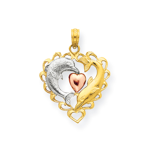 14K Two-tone & Rhodium Dolphins in Heart Pendant