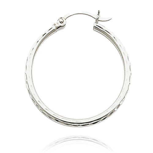 14K White Gold 2x25mm Diamond Cut Round Tube Hoops