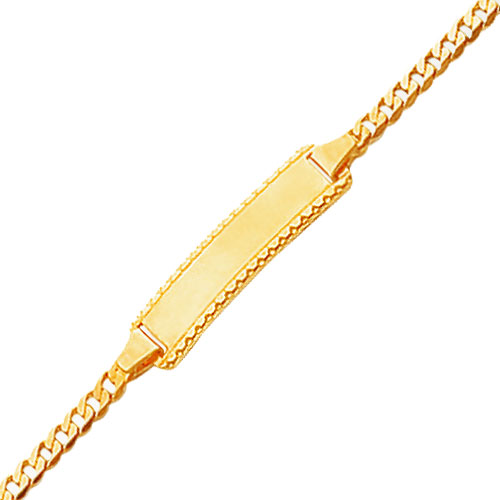 Say their name forever with this one of a kind, 6” ID bracelet! Piece is also accentuated by engraveable nameplate. This 14K Yellow Gold bracelet features sturdy curb links. Polished plate measures 2cm and has raised trim design in gold. A timeless classic!