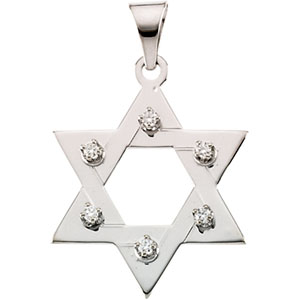 Star Of David Pendant W/diamon Quality: 14K White Size: 32.00X26.00 MM Weight: 2.81 GM Total Carat Weight: 0.1800 CT Primary Metal Composition: Gold | Stone Quantity | Stone Size | Stone | | 6 | 02.00 MM (01.89 - 02.10) Full Cut | SI1 ROUND FULL CUT G-H GENUINE DIAMOND |