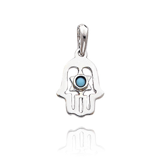 14K White Gold Turquoise Chamseh & Star of David Pendant
