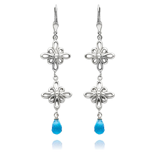 14K White Gold Double Flower With Blue Topaz Drop Leverback