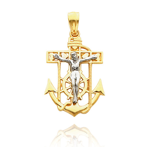 14K Yellow Gold is used to craft the cross, anchor and wheel portion of this beautiful charm, while White Gold is used for the corpus. Heart details are featured inside of the cross for added style.