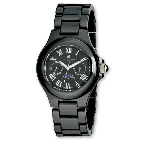 Mens Charles Hubert Black Ceramic Multifunction Watch Buckle to buckle warrt 24-hour sun and moon 3 atm water resistance 40mm case Black dial Cabochon Ceramic Ceramic band Chrome hands Dial with date Japanese quartz movement Mineral crystal Push button deployment Roman numerals Stainless steel caseback