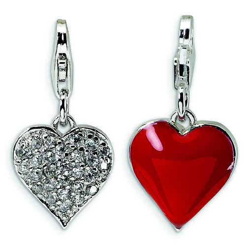 Sterling Silver 3-D Cubic Zirconia & Red Enamel Heart With Lobster Clasp Charm