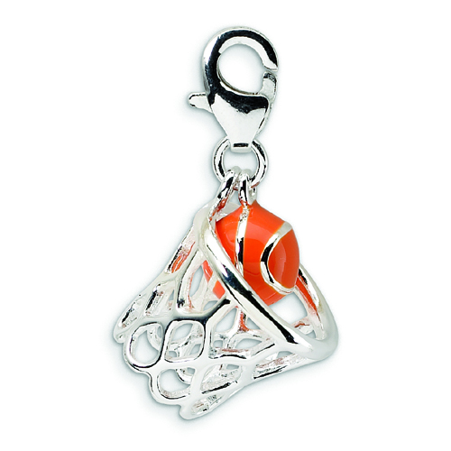 Sterling Silver 3-D Enameled Basketball In Net With Lobster Clasp Charm