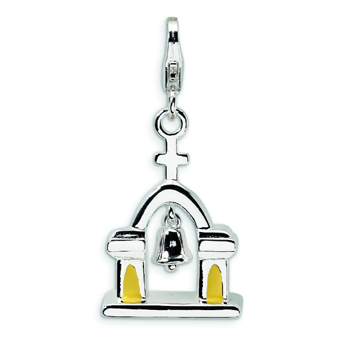 Sterling Silver 3-D Enameled Church With Moving Bell With Lobster Clasp Charm