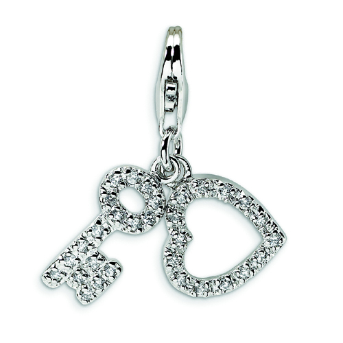 Sterling Silver Cubic Zirconia Heart and Key With Lobster Clasp Charm