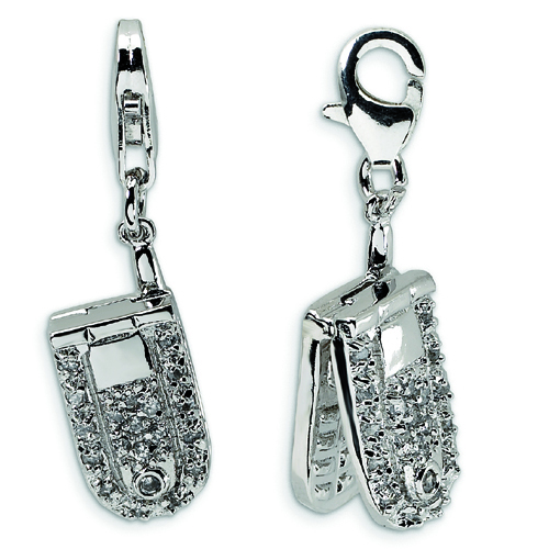 Sterling Silver Flip Cell Phone Cubic Zirconia With Lobster Clasp Charm