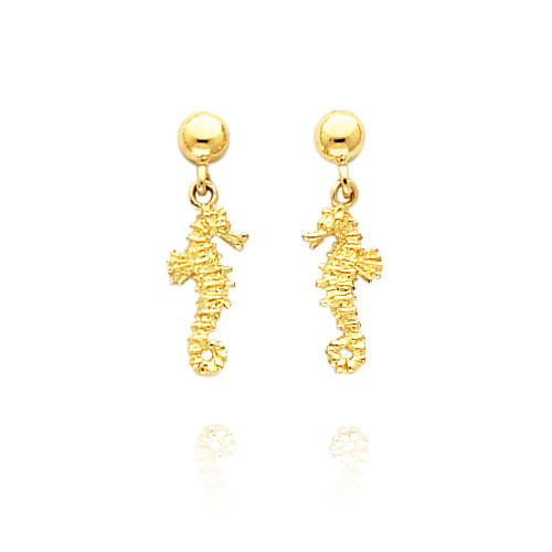 14K Yellow Gold 3D Seahorse Dangle Post Earrings