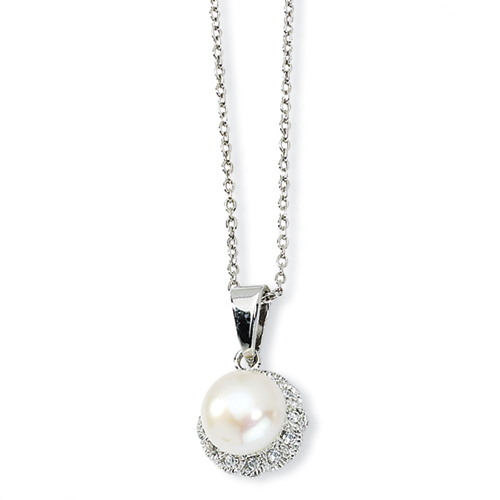Sterling Silver CZ White Cultured Pearl 18In Necklace