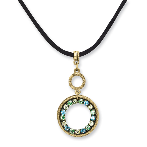 Brass-tone Blue, Green & Yellow Crystal Circle 16in With Extension Satin Cord Necklace