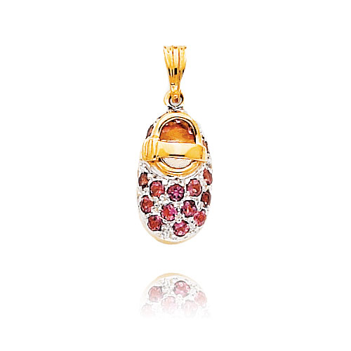 Give this keepsake as a gift to a new mother, or keep it for yourself. Rhodium covers the front of the shoe where colorful Pink Tourmaline stones are prong set to represent a child born in October. 14K Yellow Gold is used to craft this beautiful baby shoe. Pendant hangs from a polished gold bail.