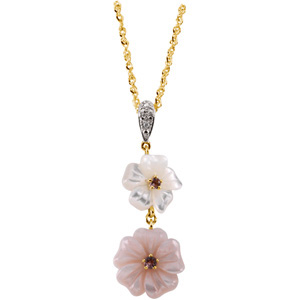 14K Yellow Gold Genuine Pink Touramline Mother Of Pearl And Diamond Pendant On 18 Solid Rope Chain""