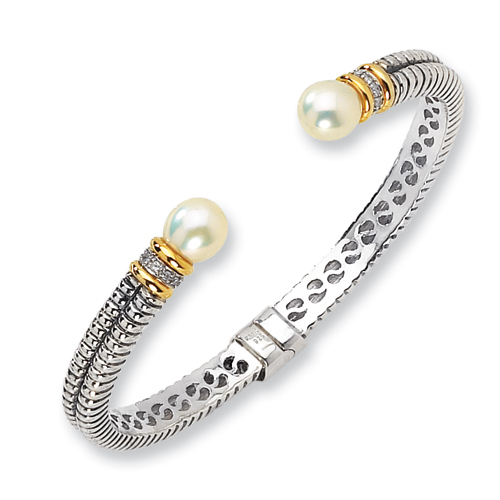 SS/14ky Diamond and 10x8mm White FW Cultured Pearl Cuff Bracelet
