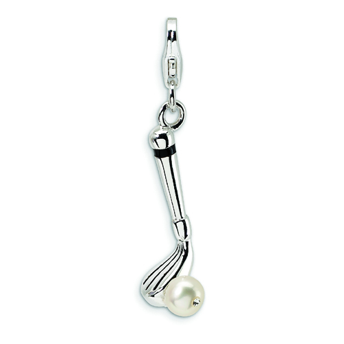 Sterling Silver 3-D Fresh Water Cultured Pearl Crystal Golf Club With Lobster Clasp Charm