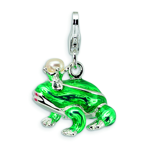 Sterling Silver Enameled Fresh Water Cult Pearl Swarovski Crystal Frog With Lobster Charm