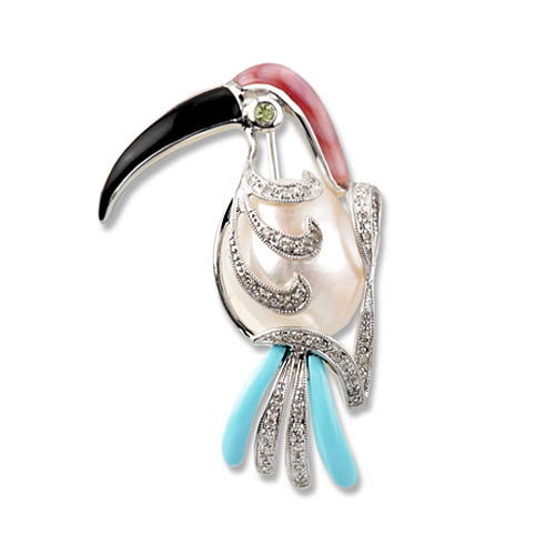 Parrot Pin w/ Diamonds, Gemstones Pearl - White Gold