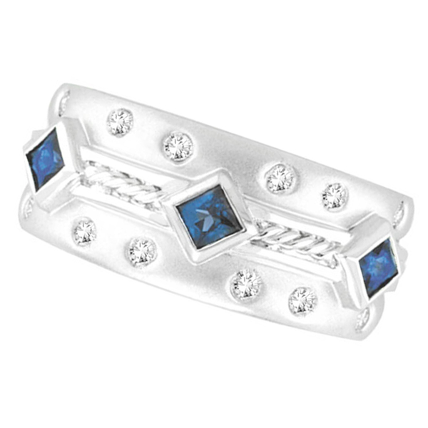 Antique Style Sapphire & Diamond Fashion Ring in 14K white gold. inch wide. This antique reproduction measures over ?From our Byzantine Collection. 3 princess cut sapphires in the front set in a bezel setting, with 12 brilliant, round diamonds set in a pave setting, which dance on the top and the bottom.