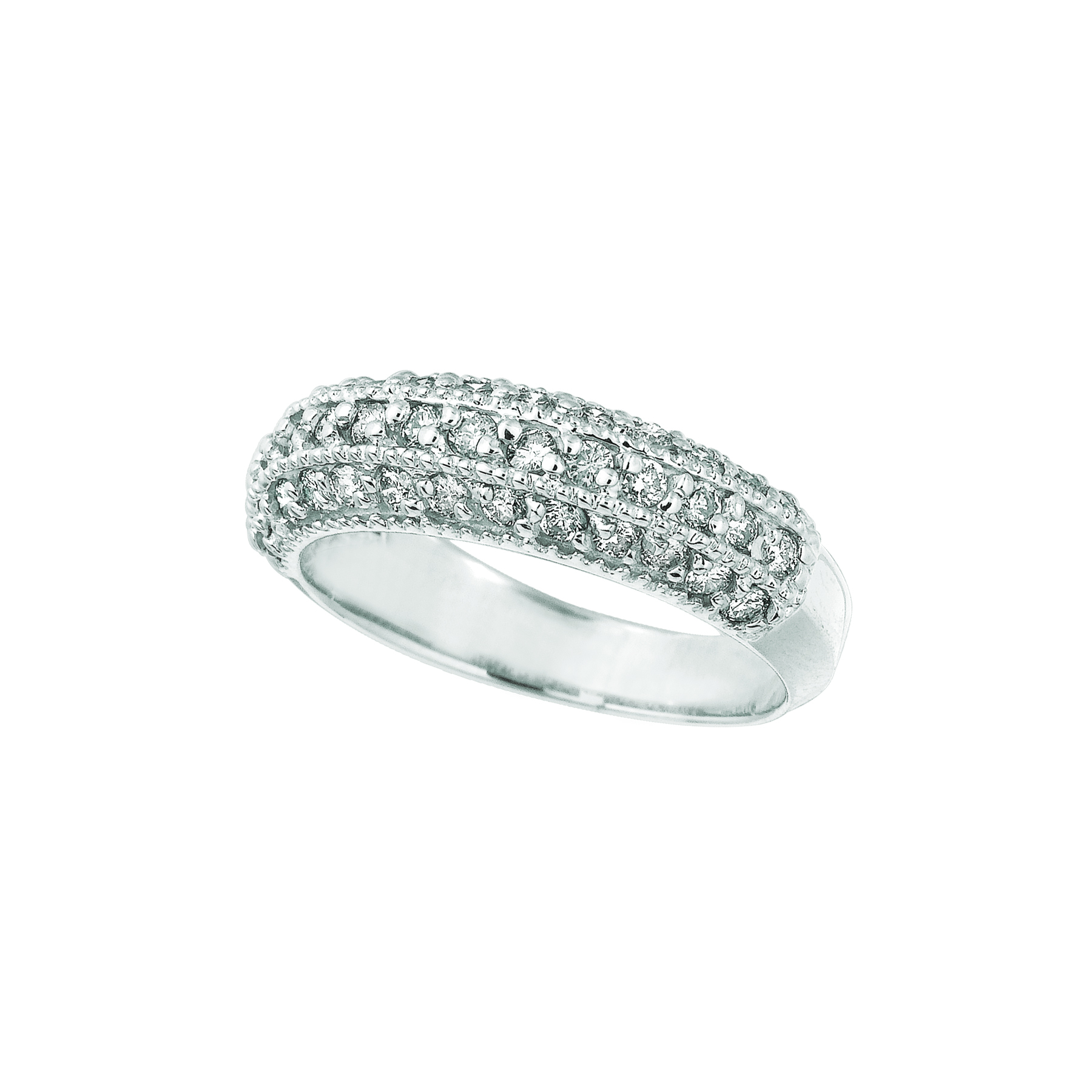 3 rows of diamonds run across the front of this ring. WEIGHT (CT): 0.84