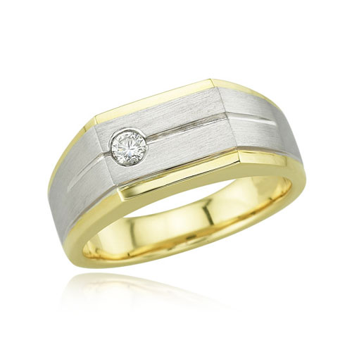 Modern and magnificent. A polished Yellow Gold band features satin finished White Gold, which is laid on top of the yellow metal and squared off to form a flat top. A single, round, shiny Diamond is set off to the side of the flat front for a modern and simple look.